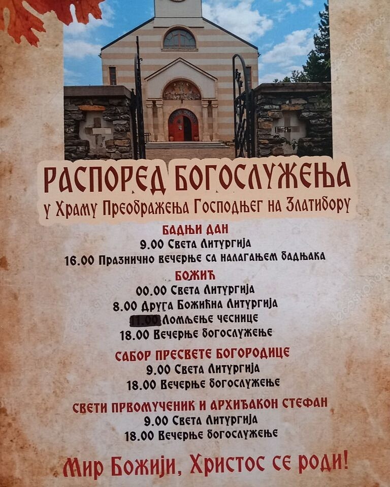 Schedule of services at the Church of the Transfiguration of the Lord in Zlatibor