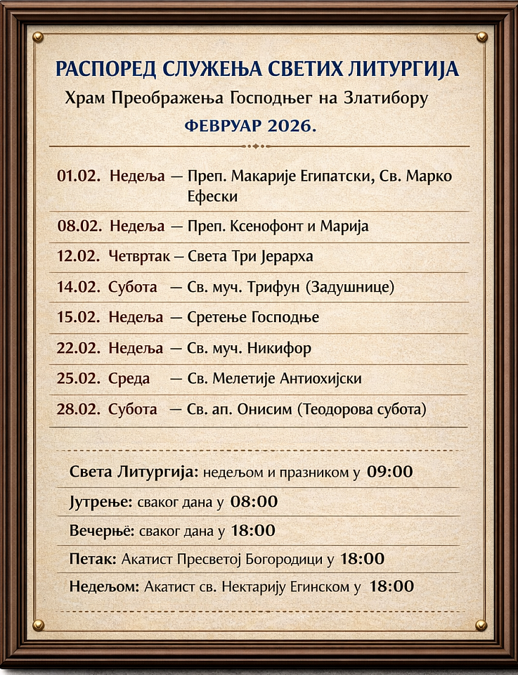 Schedule of Divine Liturgy Services for February 2026 in the Church of the Transfiguration of the Lord in Zlatibor