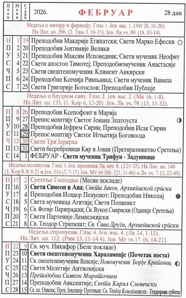 - 22. 02. - Syropusna Sunday (i.e. White Offerings, a day dedicated to forgiveness from white sin, but above all to forgiveness of those who have sinned against us, so that we may peacefully and with pure hearts sail into the waters of Lent, to meet the Lord.)
