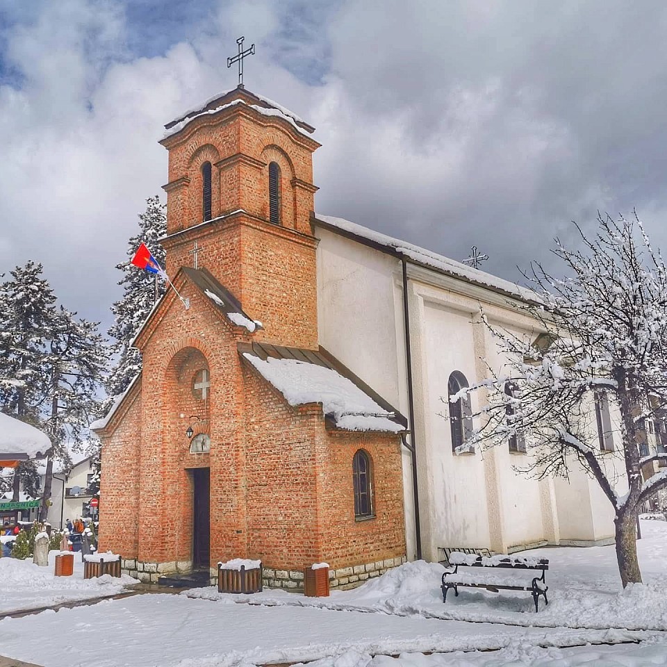 Architecture and appearance The temple was built as a monumental brick building in the Serbian-Byzantine style. It is recognizable by its harmonious central dome and raised bell tower, while the snow-white facade in combination with the stone pediment gives the church a dignified appearance that fits perfectly into the mountain environment. The interior of the temple is filled with light, with a carefully selected wooden iconostasis and marble floor, while the gradually created frescoes further enrich this sacred space.